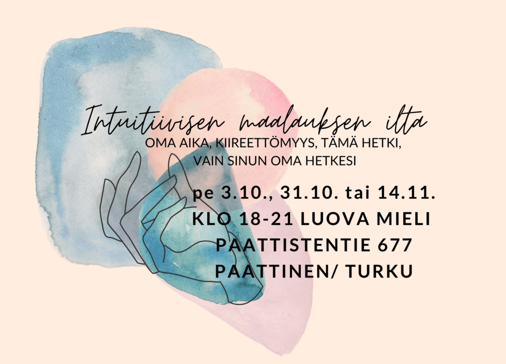 Haluat kenties hetken hengähtää viikon tapahtumien jälkeen? Intuitiivisen maalauksen ilta antaa sinulle oivan tilaisuuden nollata viikkoa ja astua eheämpänä kohti viikonloppua. Illan aluksi pieni alustus välineistöstä ja tämän jälkeen virittäydymme tunnelmaan meditaatioharjoituksen avulla. Virittäytymisen jälkeen jokainen pääsee maalaamaan omaa maalaustaan kaikessa rauhassa. Illan päätteeksi rupatellaan hetki maalauksista ja tehdään loppuun vielä rentoutusharjoitus.